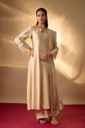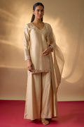 Designed for those who love tradition with a hint of modern ease, this coral Chanderi kurta is embroidered with fine gold zardosi along the neckline and sleeves. Floral details lend quiet charm, while palazzo pants and a organza dupatta keep the silhouette effortless yet refined.