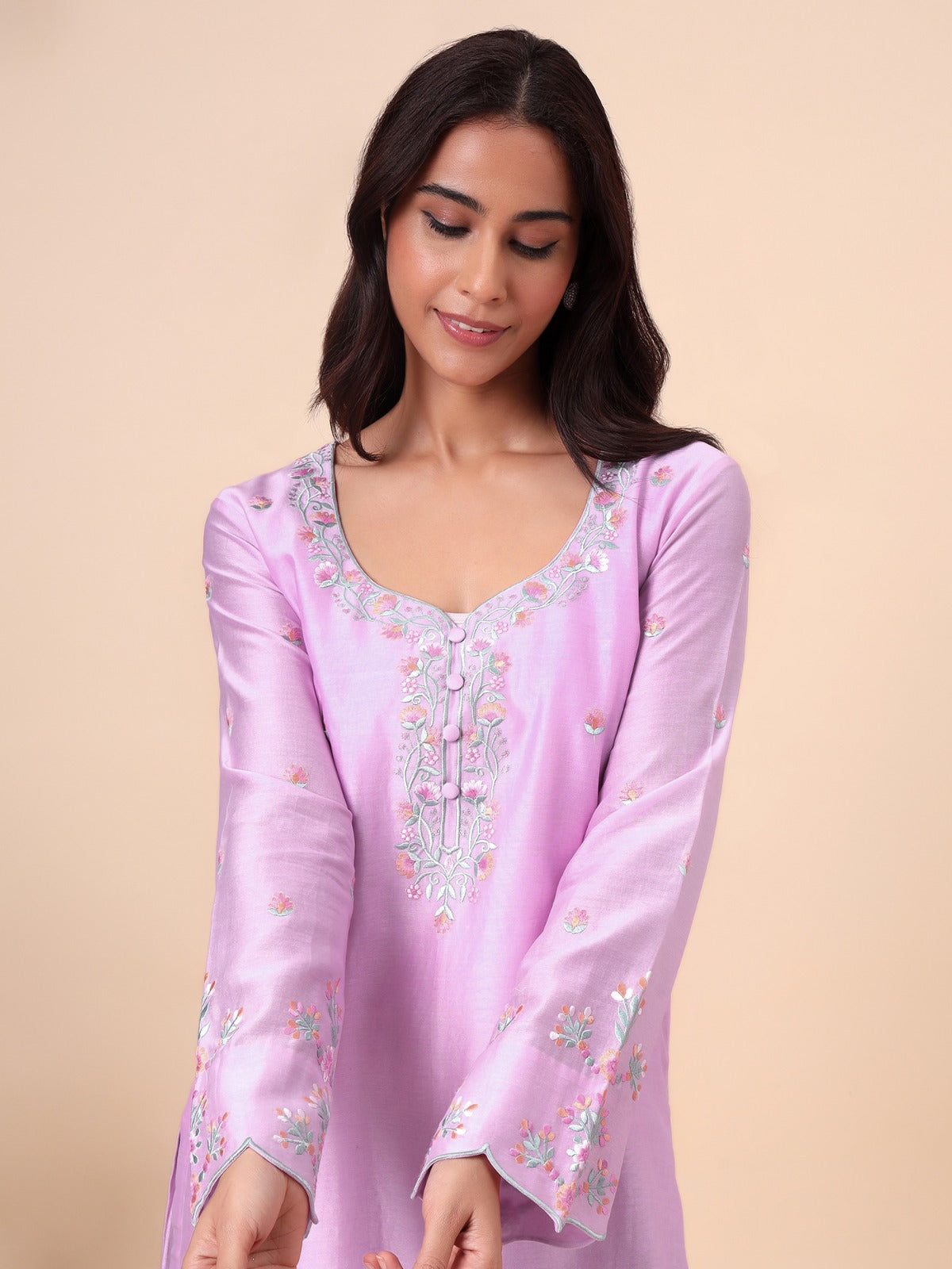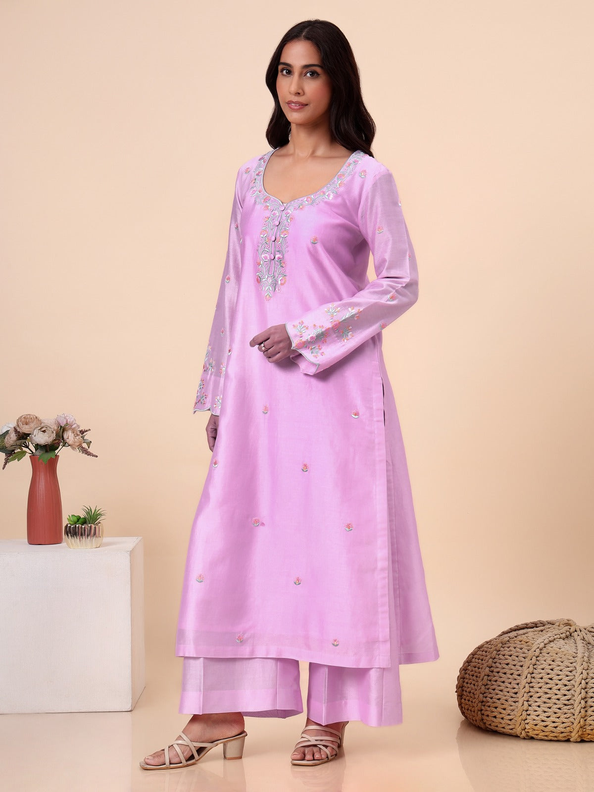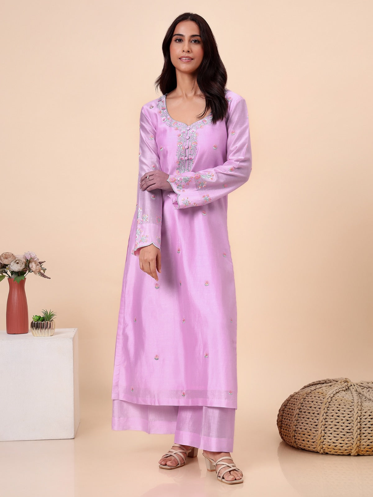 Crafted in luxurious handwoven silk, this baby pink kurta set radiates soft elegance and charm. The kurta features delicate floral embroidery along the neckline and sleeves, highlighted by dainty embroidered motifs across the fabric. Paired with matching straight pants and a sheer organza dupatta finished with scalloped edges, the ensemble beautifully blends classic craftsmanship with contemporary finesse.