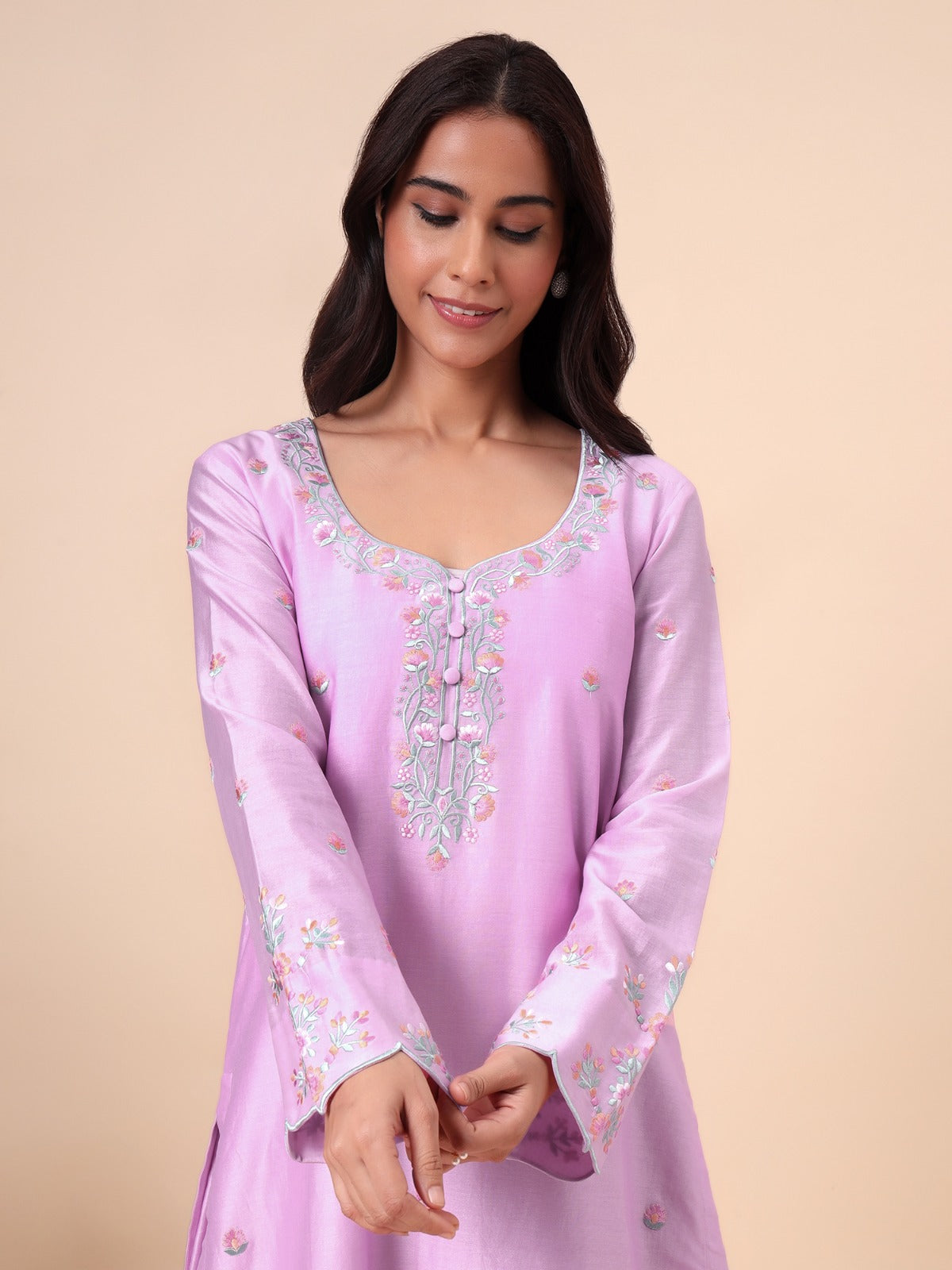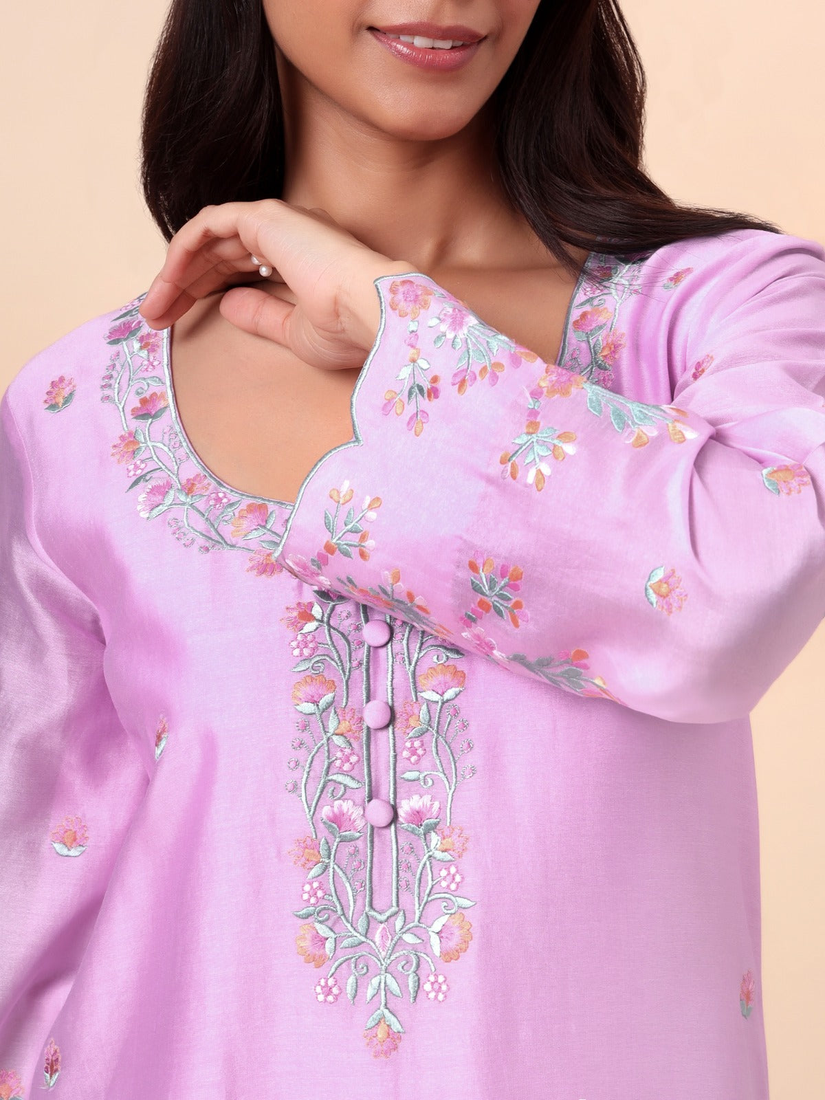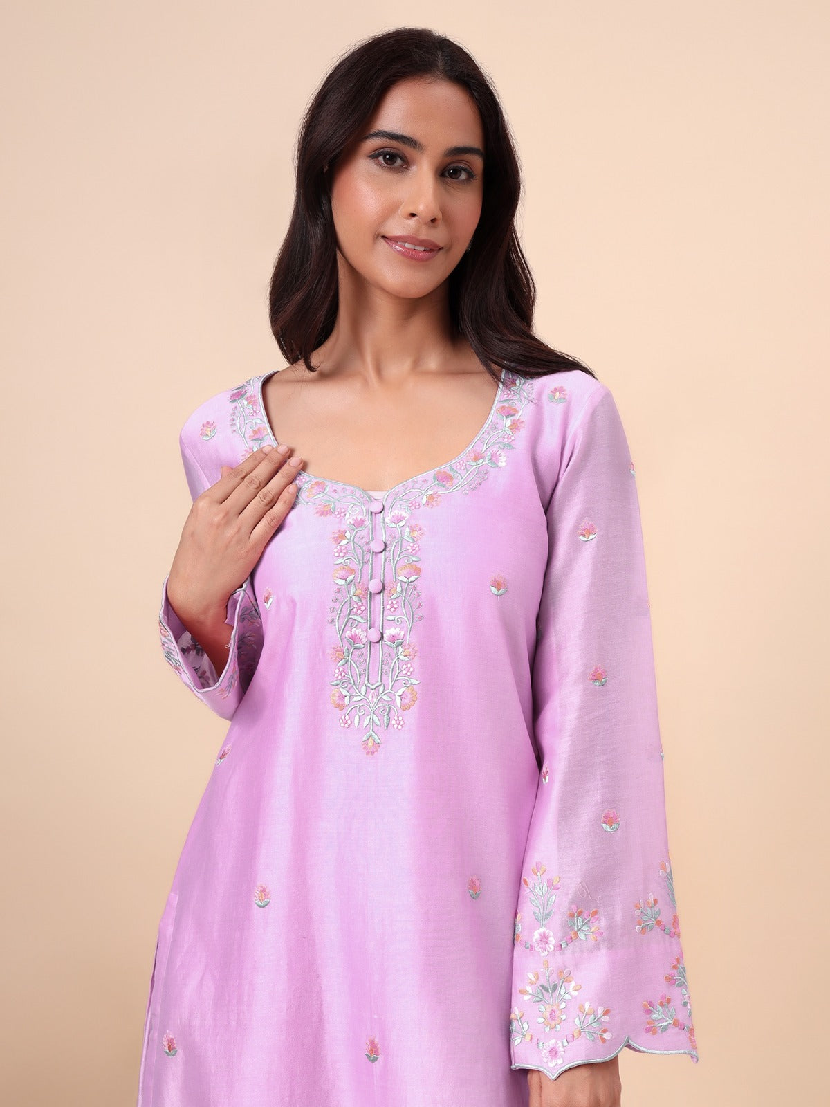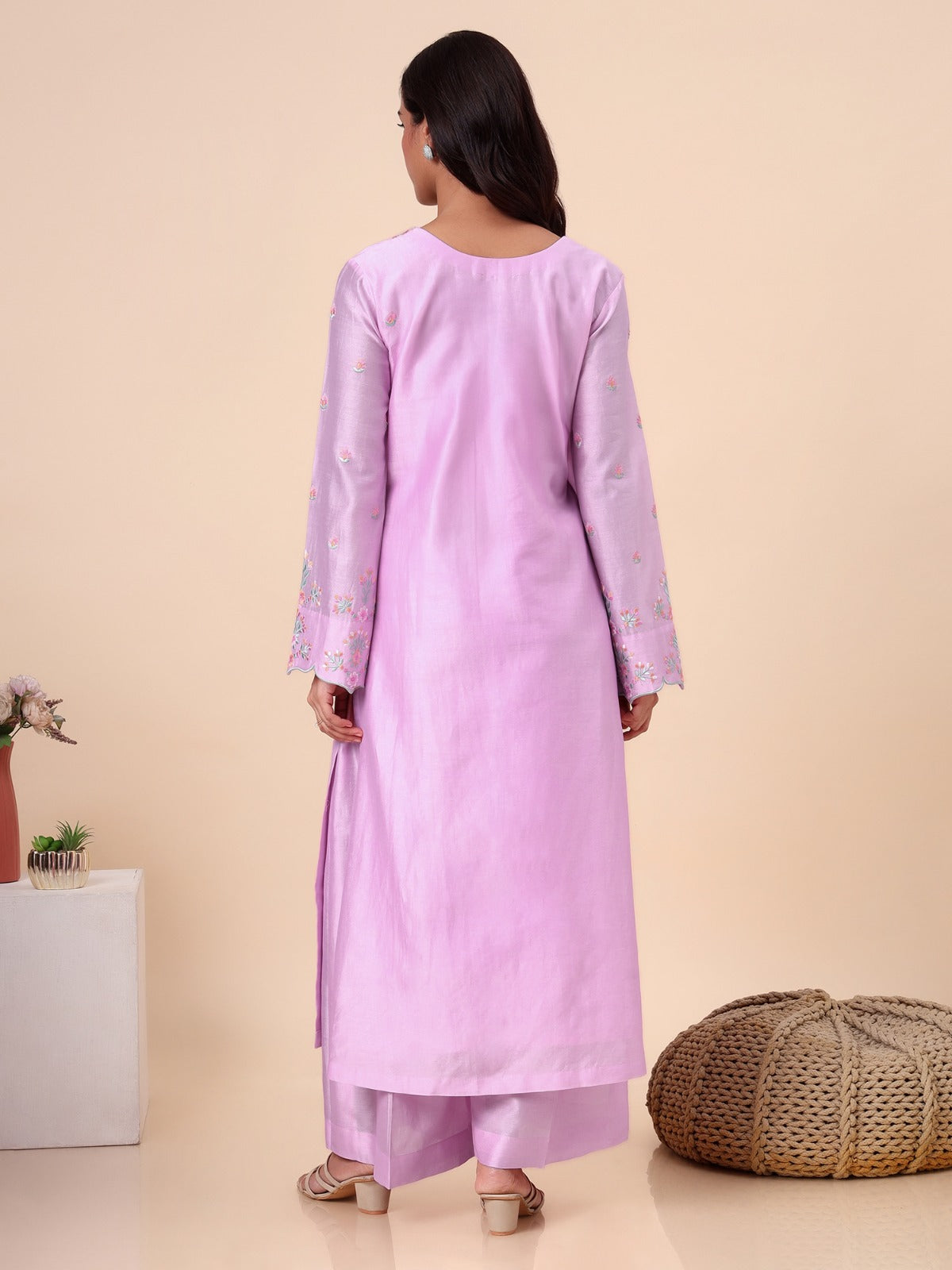 Crafted in luxurious handwoven silk, this baby pink kurta set radiates soft elegance and charm. The kurta features delicate floral embroidery along the neckline and sleeves, highlighted by dainty embroidered motifs across the fabric. Paired with matching straight pants and a sheer organza dupatta finished with scalloped edges, the ensemble beautifully blends classic craftsmanship with contemporary finesse.