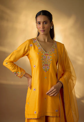 NIYAH - Mango Yellow Hand woven chanderi silk Sharara suit set with zardozi embroidery