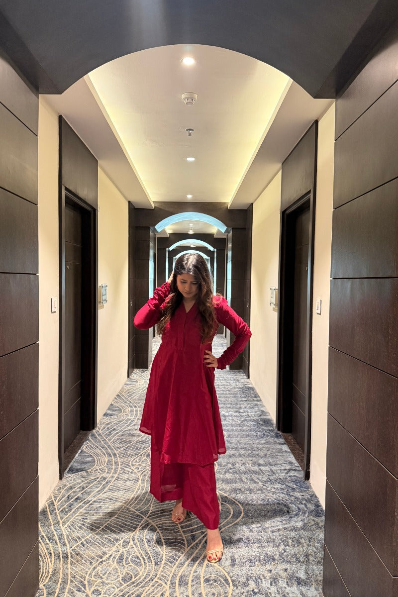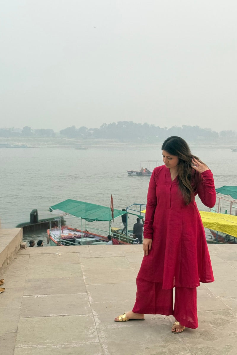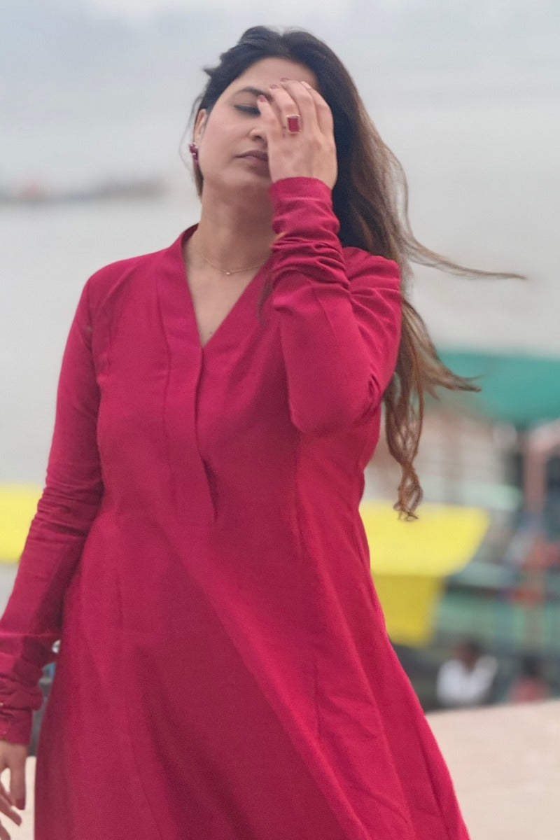 Crafted in pure handwoven Chanderi fabric, this Crimson Rose kurta set features a soft, fluid drape with a subtle natural sheen. Designed for effortless elegance, the relaxed silhouette offers comfort while maintaining a graceful fall. Paired with a tonal dupatta, this ensemble is perfect for festive gatherings, day occasions, and understated celebrations. roduct Details