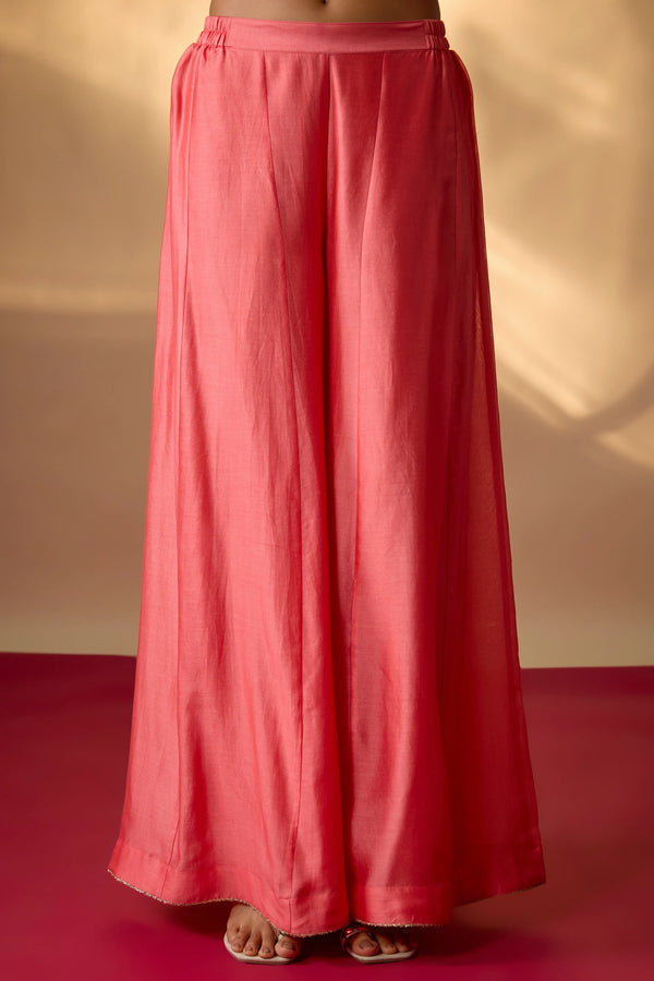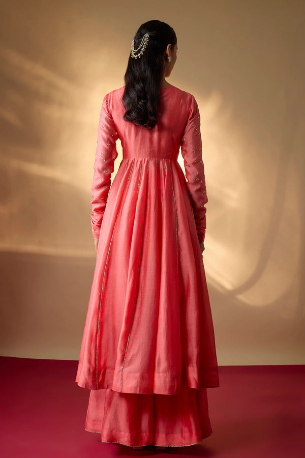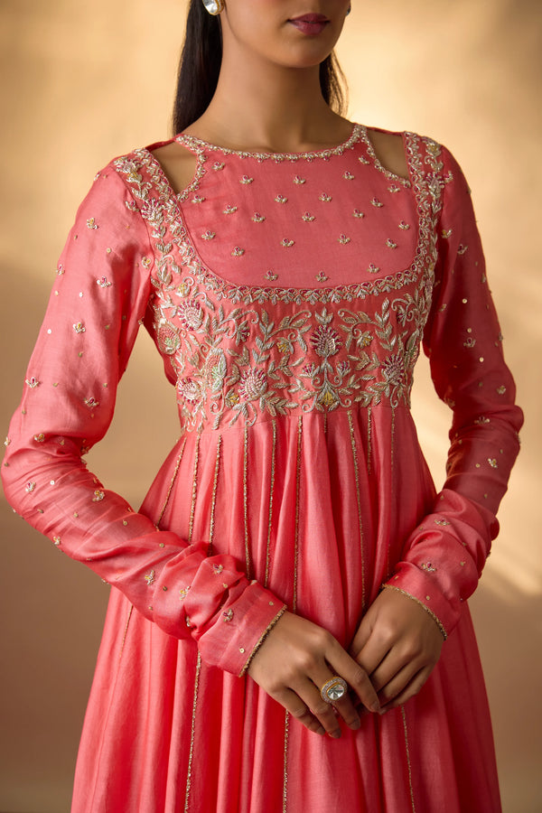 Radiating festive warmth, this coral chanderi anarkali is crafted with exquisite attention to detail. The neckline beautifully frames the yoke, richly hand-embroidered with gold florals and delicate motifs. Intricate buti work adorns the sleeves, while the voluminous flare moves gracefully with every step. Paired with kali pants and a sheer organza dupatta, this ensemble is a perfect choice for occasions that call for timeless elegance and understated grandeur.