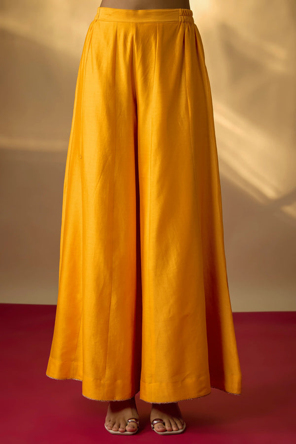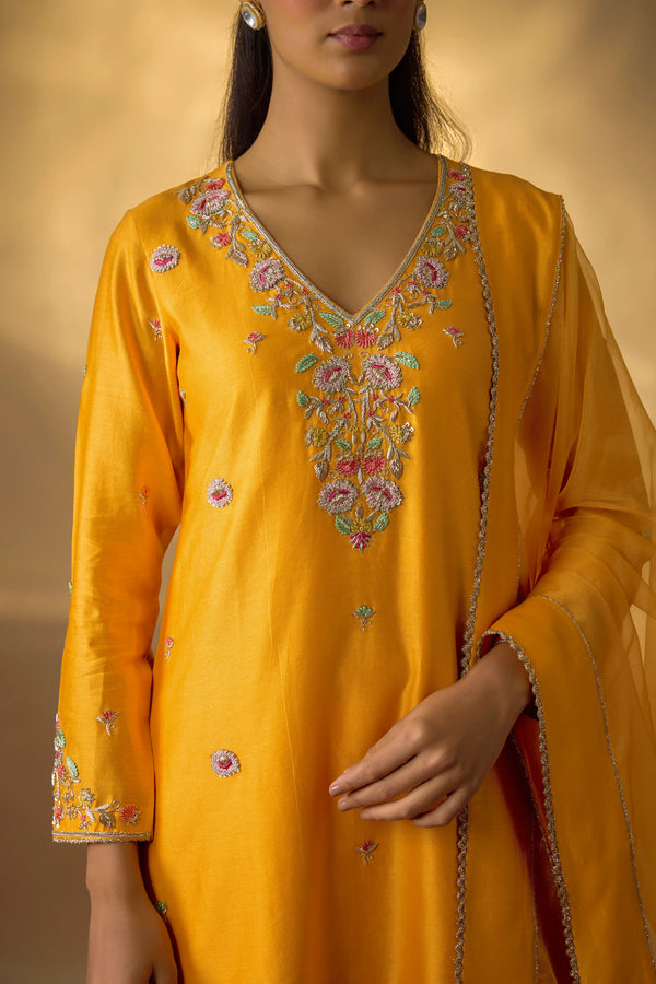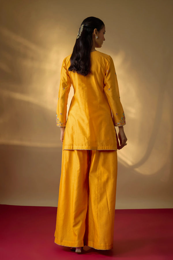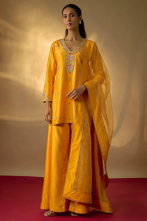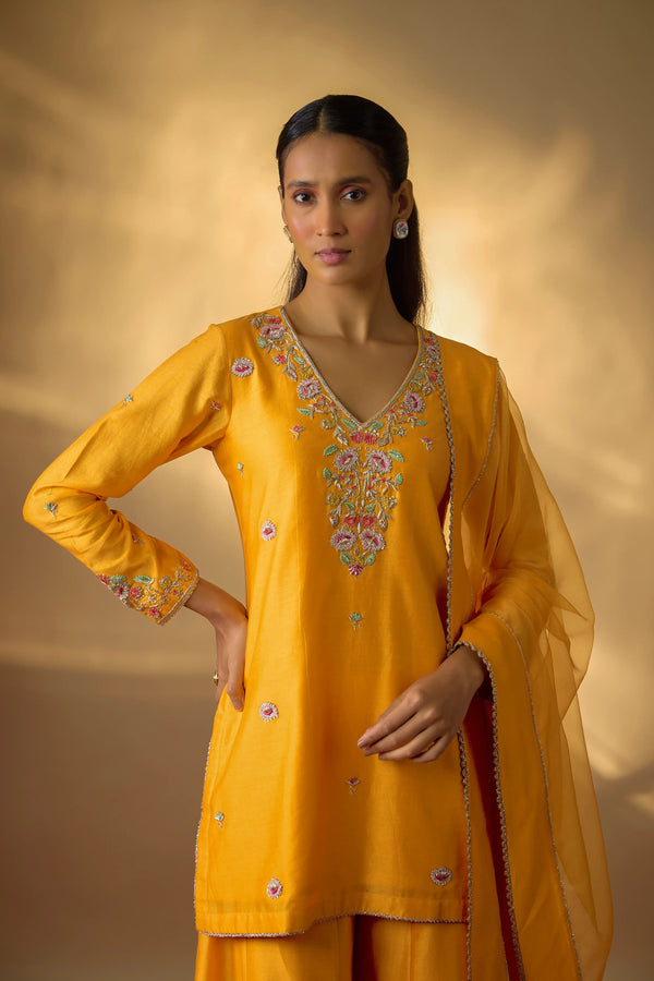This mango yellow kurta set in pure Chanderi is defined by its vibrant hue and fine detailing. The neckline and sleeves are intricately highlighted with multicolour zardosi embroidery, while scattered floral motifs add a delicate charm to the silhouette. The short kurta is paired with wide kali pants, creating a look that is both festive and contemporary.