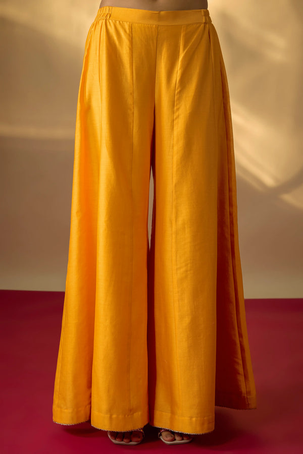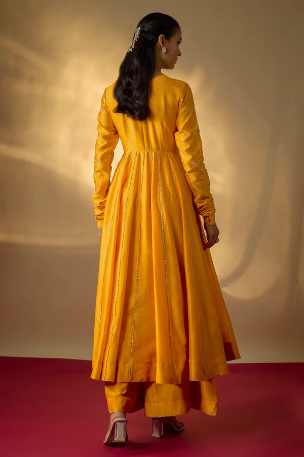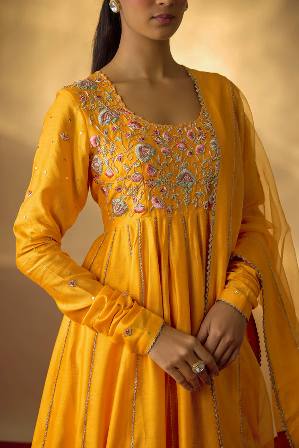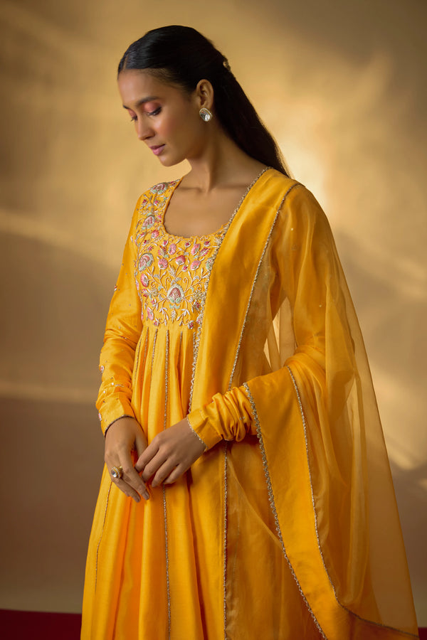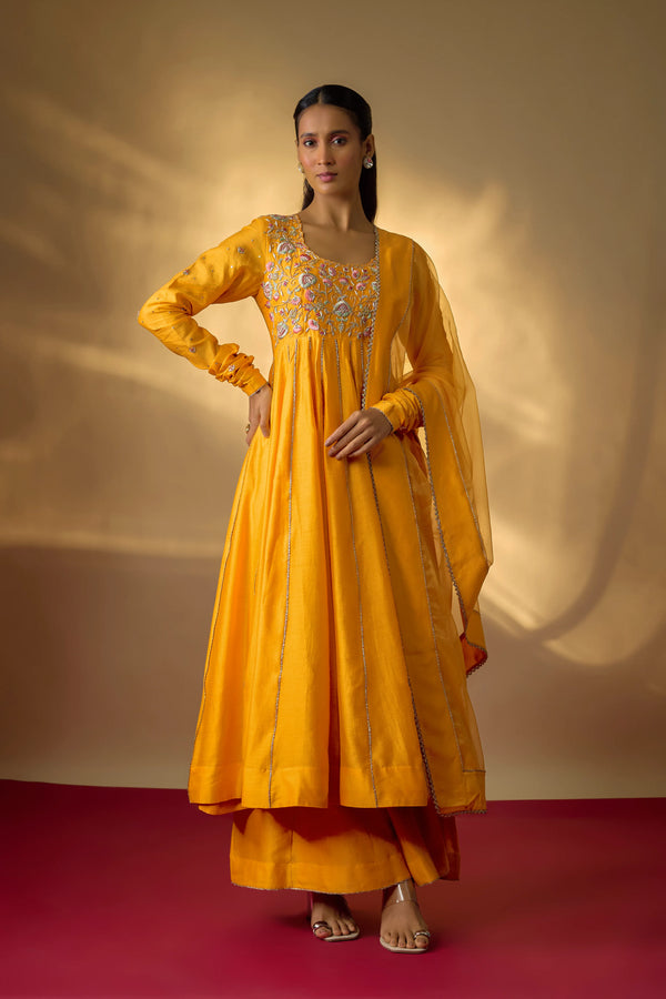 Crafted in pure Chanderi, this mango yellow Anarkali set is an ode to timeless artistry. The bodice is adorned with multicolour zardosi hand embroidery, where every stitch brings depth, colour, and character to the silhouette. Its graceful flare and delicately detailed sleeves lend a fluid elegance that feels both classic and contemporary. The look is completed with kali pants for effortless comfort and a sheer organza dupatta.