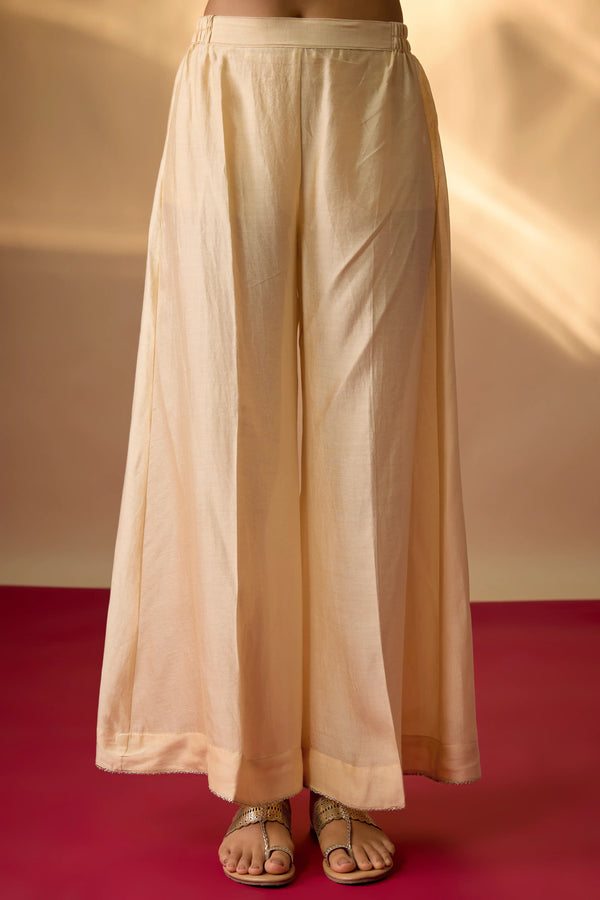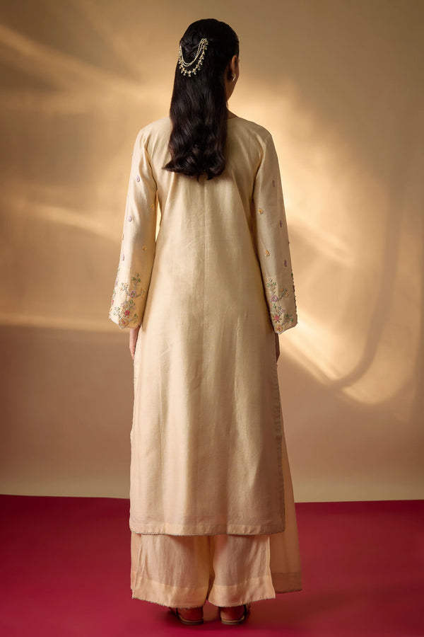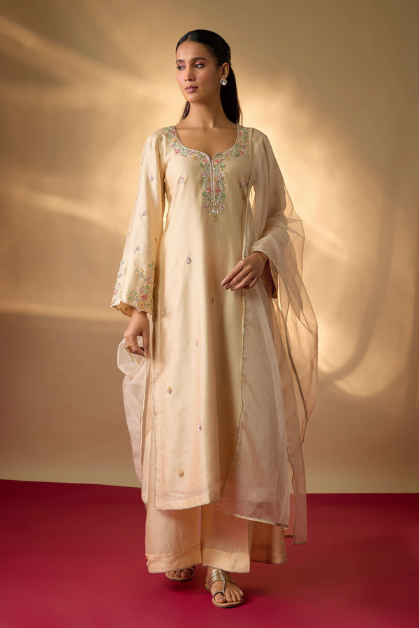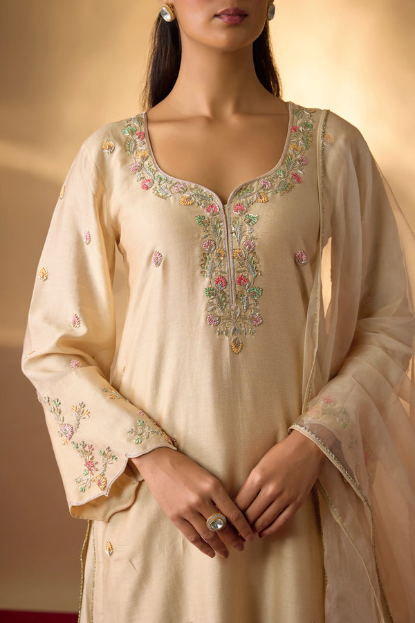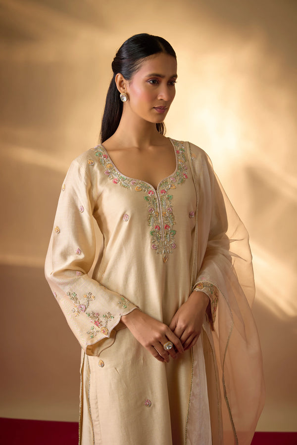 This beige Chanderi kurta strikes the perfect balance between elegance and subtlety. Hand-embroidered with delicate zardosi motifs in pastel pinks and greens, it features intricate detailing along the neckline, sleeves, and scattered butis across the body. The soft sheen of Chanderi fabric enhances its refined charm, making it a versatile choice for daytime festivities or intimate evening gatherings. Paired with palazzo pants and a sheer organza dupatta.